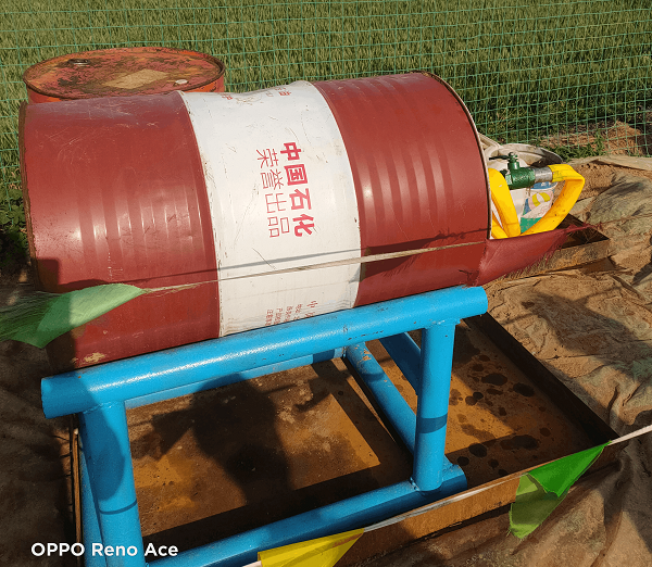 废旧油桶的再利用。在野外施工作业中,电机通常裸露在外,易产生安全隐患,经过现场反复研究试验,214分队工人将废旧油桶割开,两边锤平整,加工处理后改装成防护罩,能够很好的解决野外电机裸露在外的问题。通过对废旧油桶的再利用,能够在不影响电机的正常通风散热的情况下,有效防止电机的接线盒因雨淋等原因引起的机电设备连电、烧损等情况,既节省了成本,也取得了良好的效果。